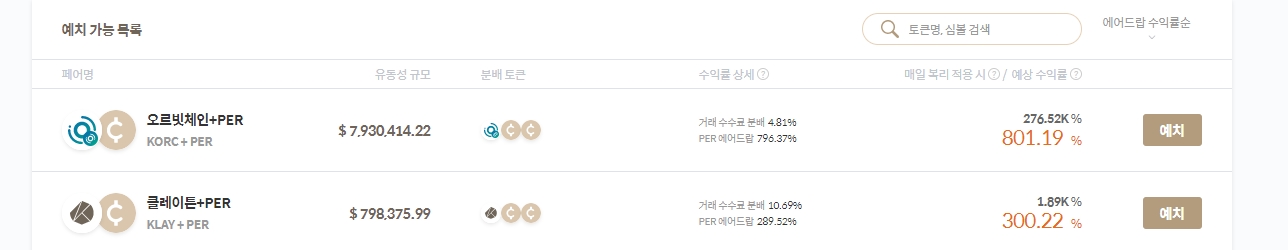 클레이스왑 예치 리스트를 보면 [KORC-PER] [KLAY-PER] 목록을 확인할 수 있다.